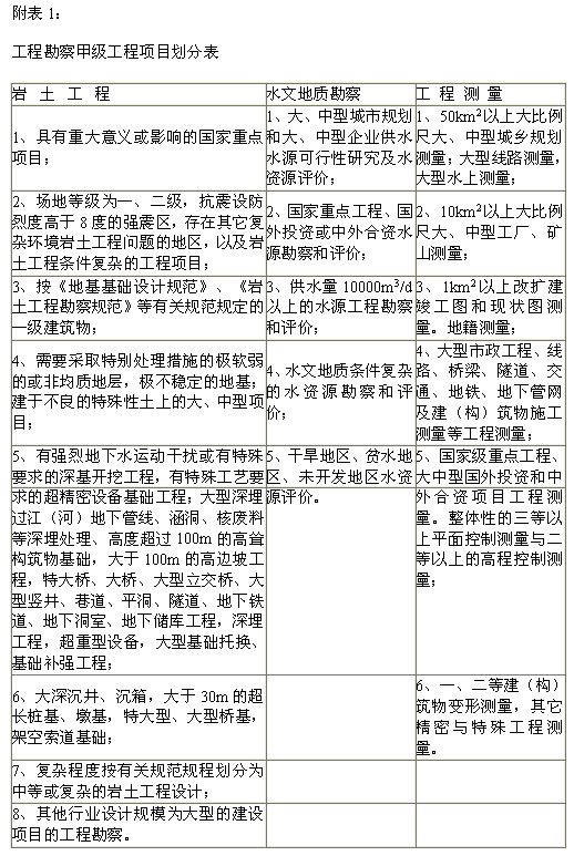 附表1:工程勘察甲级工程项目划分表