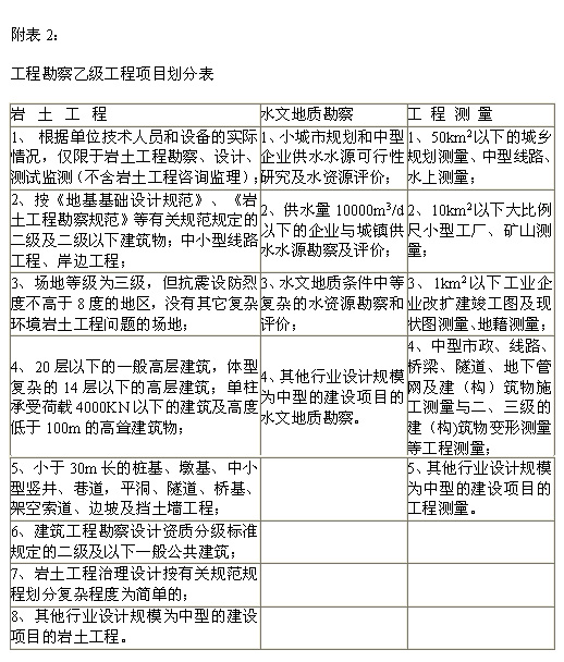 附表2:工程勘察乙级工程项目划分表