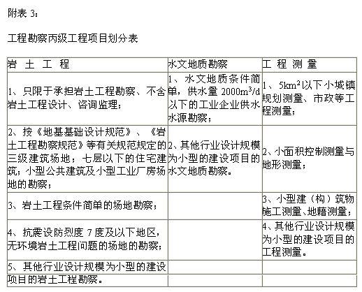 (四)专业类丙级工程勘察单位可承担本专业工程勘察小型工程项目(工程勘察小型工程项目见附表),承担工程勘察业务限定在省、自治区、直辖市所辖行政区范围内。